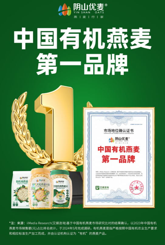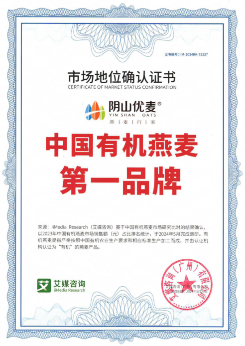 2024年5月,陰山優(yōu)麥獲艾媒咨詢授予的“中國有機(jī)燕麥第、一品牌”市場地位認(rèn)證書,此項(xiàng)認(rèn)證,是陰山優(yōu)麥品牌發(fā)展史上的一個(gè)重要里程碑,標(biāo)志著陰山優(yōu)麥在有機(jī)燕麥行業(yè)取得領(lǐng)導(dǎo)地位。
