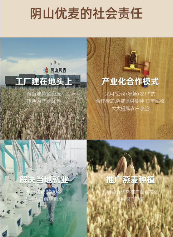陰山優(yōu)麥在追求企業(yè)發(fā)展的同時(shí),不忘回饋社會(huì),積極參與公益事業(yè),助力鄉(xiāng)村振興。公司通過加強(qiáng)農(nóng)企利益聯(lián)結(jié),把農(nóng)戶納入到燕麥產(chǎn)業(yè)中來,除了加大土地流轉(zhuǎn),讓農(nóng)民取得穩(wěn)定的地租收益,還通過訂單模式,約定燕麥原糧回收保底價(jià)格,幫助農(nóng)民解決“賣難”問題。而且,陰山優(yōu)麥每年還為農(nóng)民捐贈(zèng)燕麥良種、提供技術(shù)培訓(xùn)、增加就業(yè)崗位,幫助農(nóng)民增收致富。在陰山優(yōu)麥的帶動(dòng)下,當(dāng)?shù)剞r(nóng)戶對種植燕麥的積極性大幅增加,當(dāng)?shù)匮帑湻N植面積和原糧價(jià)格也逐漸提升,進(jìn)一步推動(dòng)了當(dāng)?shù)匮帑湲a(chǎn)業(yè)邁向規(guī)?;?、現(xiàn)代化、產(chǎn)業(yè)化發(fā)展的新臺(tái)階。